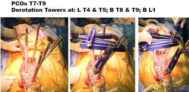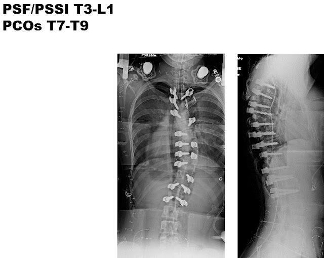 In order to maximize 3-dimensional correction and long-term outcome, while minimizing need for any additional surgeries the plan was to do a T3 to L1 posterior spinal fusion. T7-T8 and T8-T9 PCOs, or posterior column osteotomies were also performed. These osteotomies (PCOs) are done at the time of surgery to increase spine flexibility in all 3 planes, to maximize spinal deformity correction to as close to “normal” as we can safely achieve.